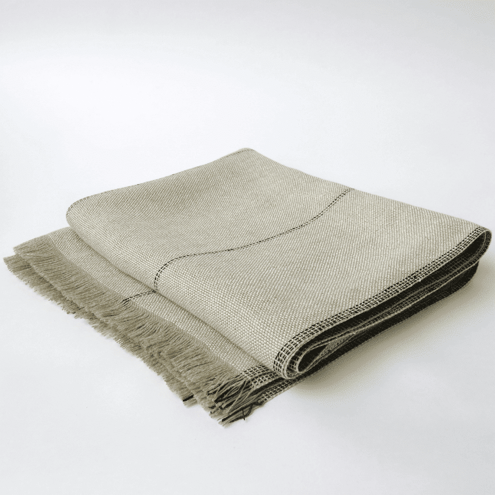 Un plaid de lino en tonos naturales y con sutiles líneas realizadas mediante costuras. Inspirado en el arte de la cestería por la estructura de su tejido y realizado enteramente en lino de procedencia europea.