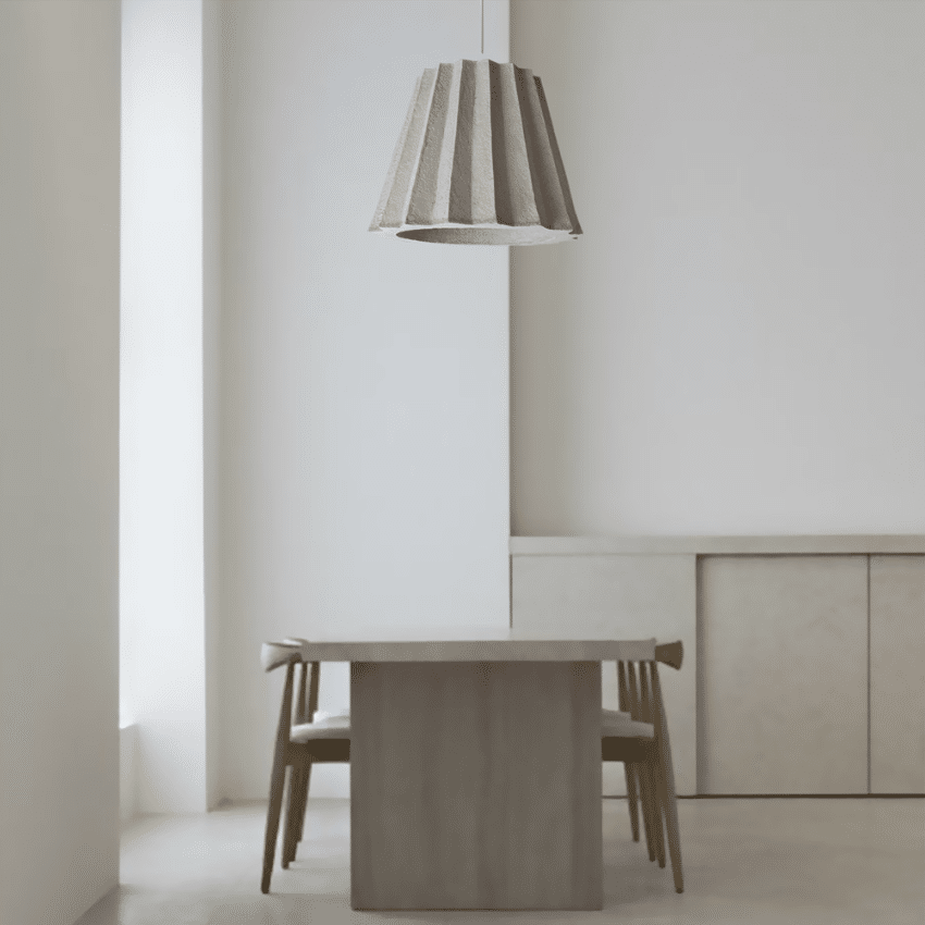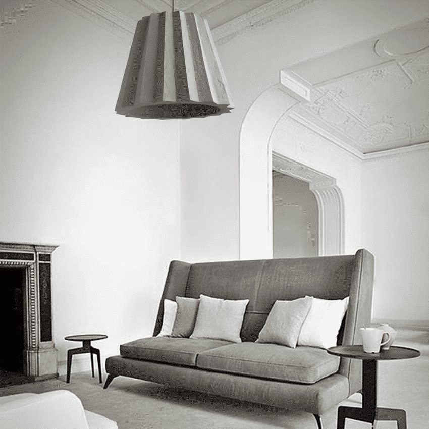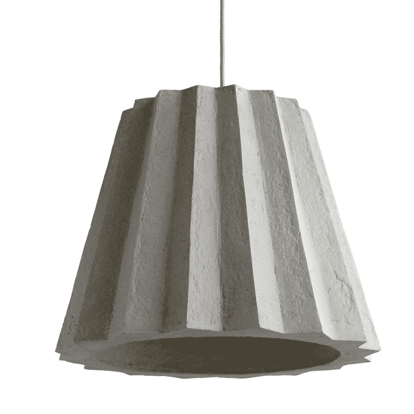 La lámpara monumental colgante «Plise» es una versión contemporánea del modelo clásico. Material ilusorio y la impresión engañosa de peso son impulsados por el gran formato de esta lámpara. La exclusiva tecnología Indi de «papercrete» crea la impresión de hormigón y mantiene un peso ligero.