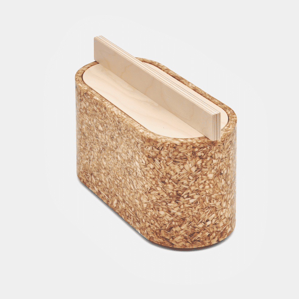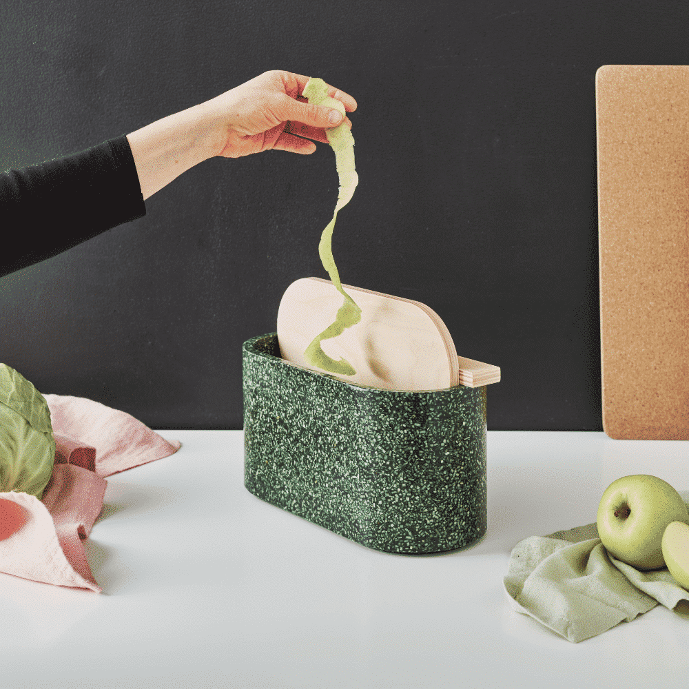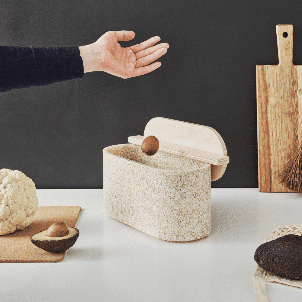 Recipiente de mesa residuos orgánicos Biowaste fabricada por Woodio a partir de virutas de madera.