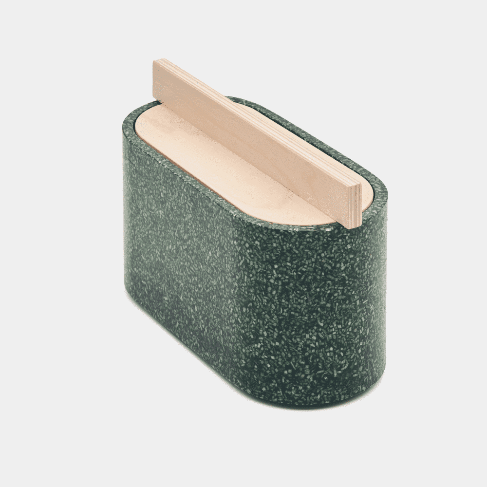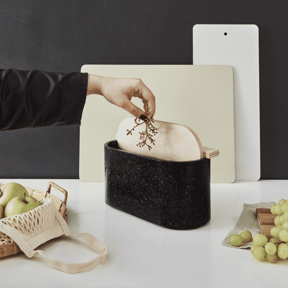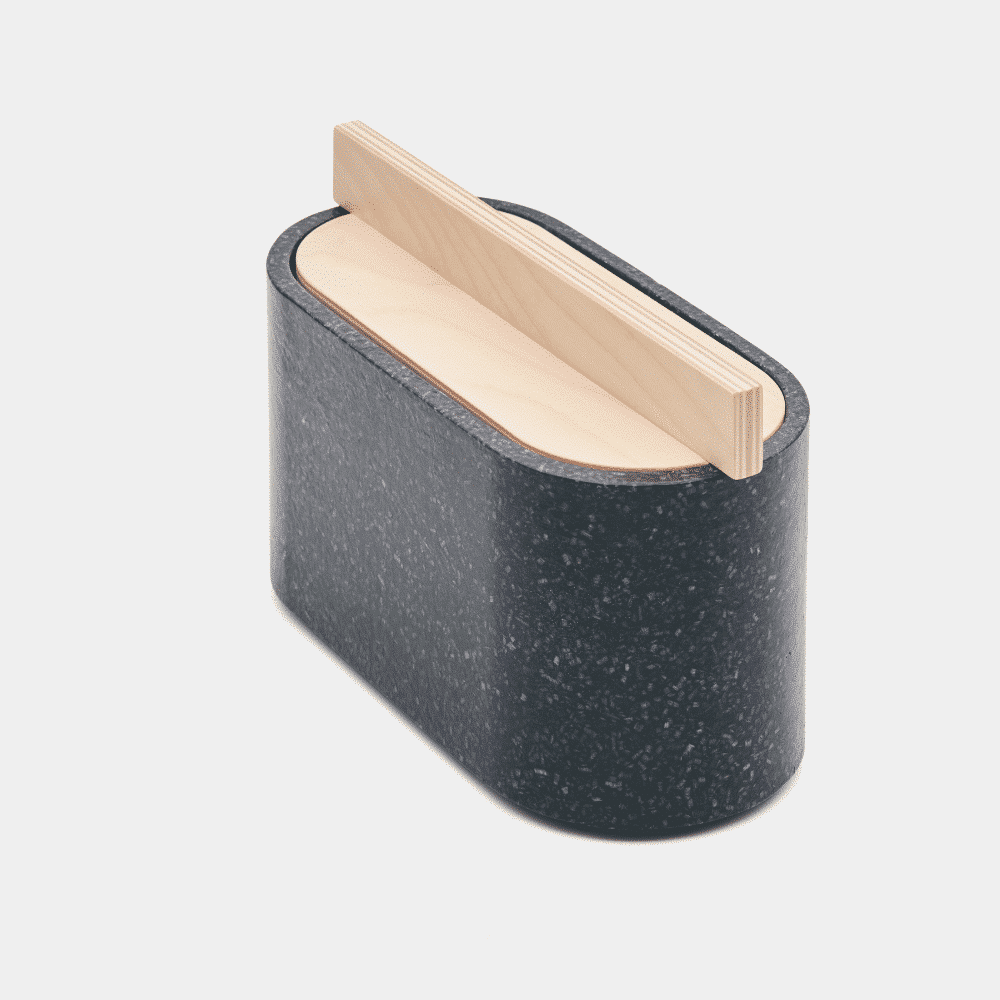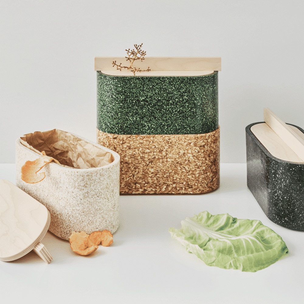 Recipiente de mesa residuos orgánicos Biowaste fabricada por Woodio a partir de virutas de madera.