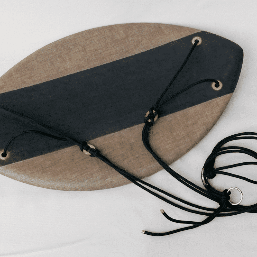 Laminado con tejido de lino y resina epoxi de origen vegetal en un 56%. Pigmento vegetal azul índigo (Indigofera Tinctoria o Dyers’ Indigo).Accesorios de latón. Cuerda de kevlar de 6 mm, negra.