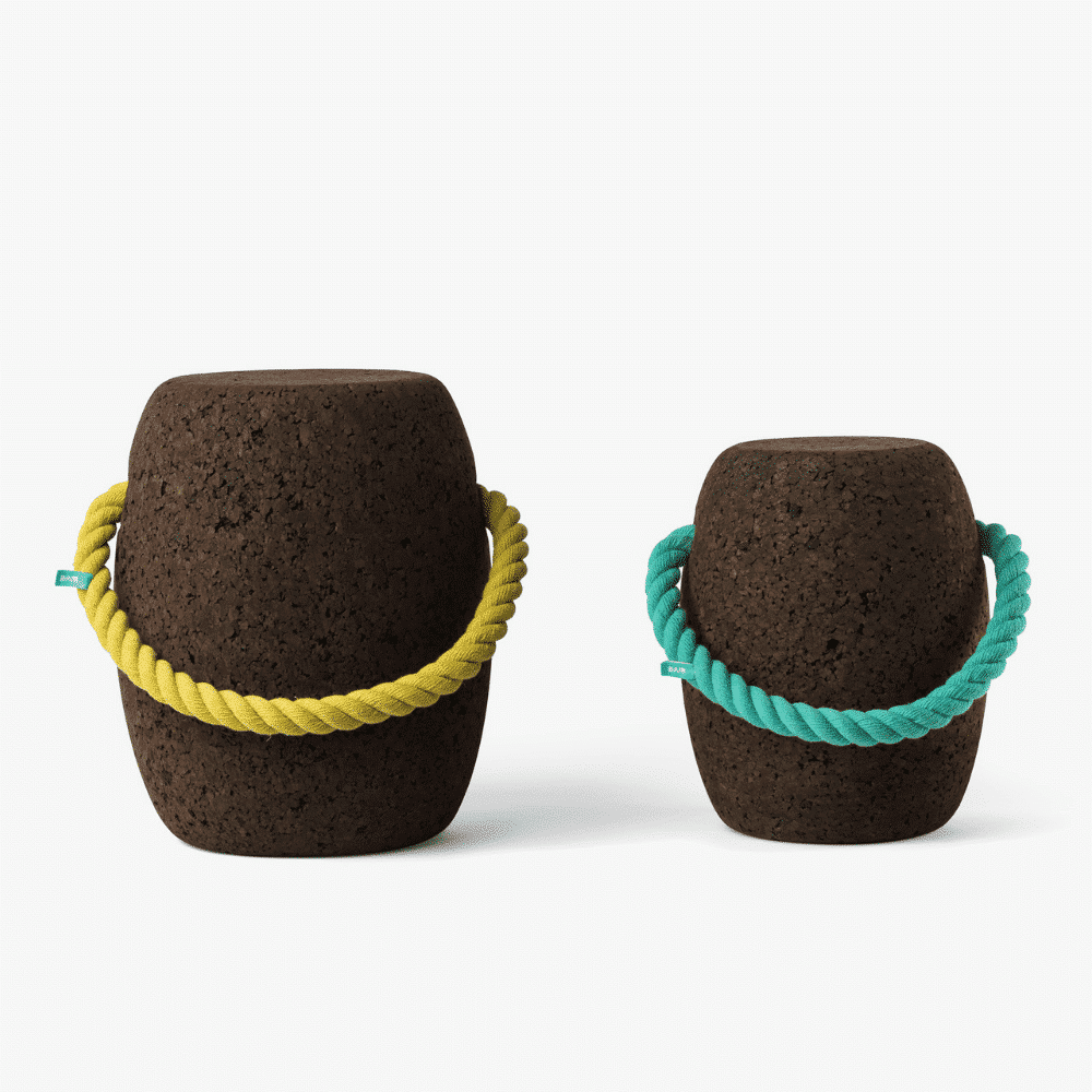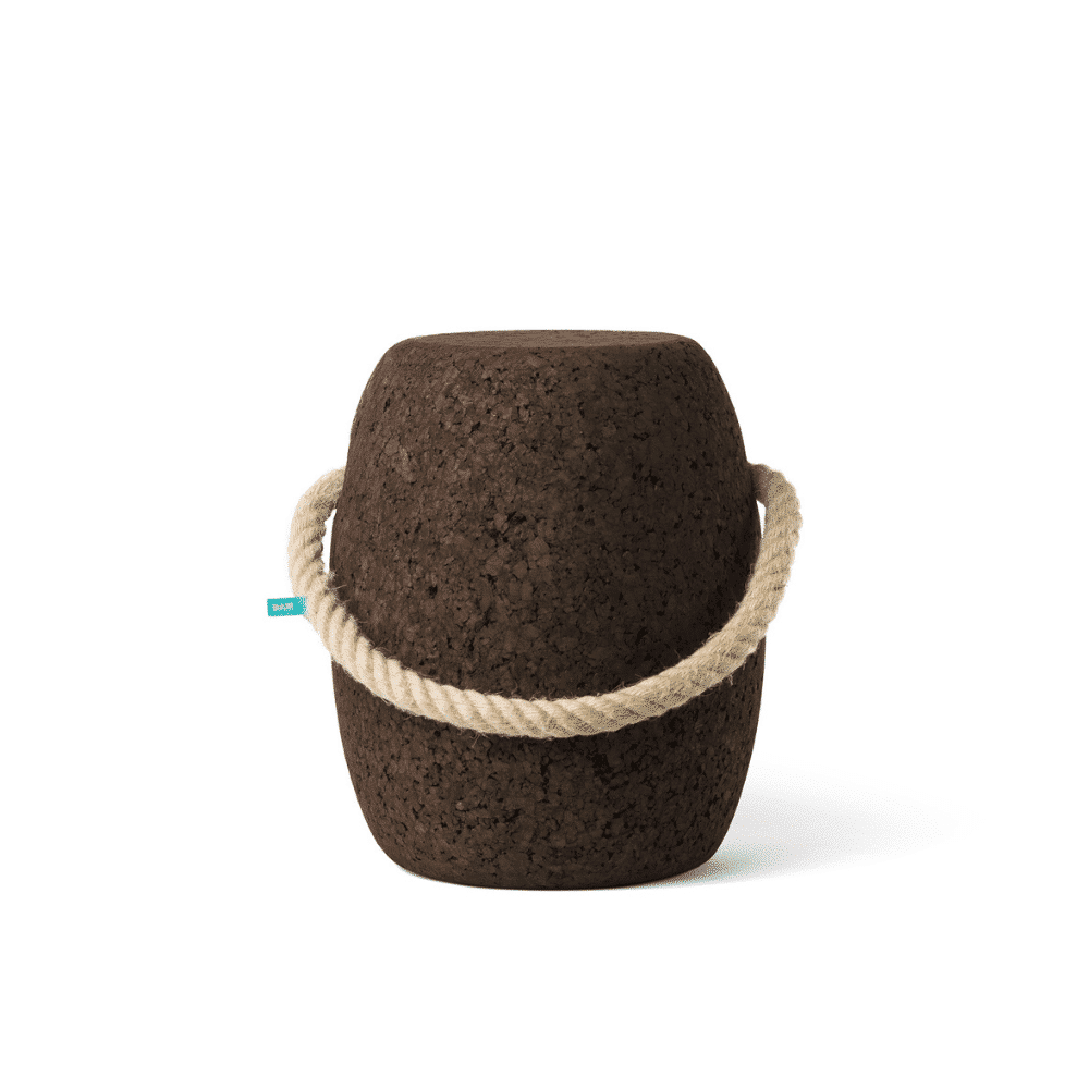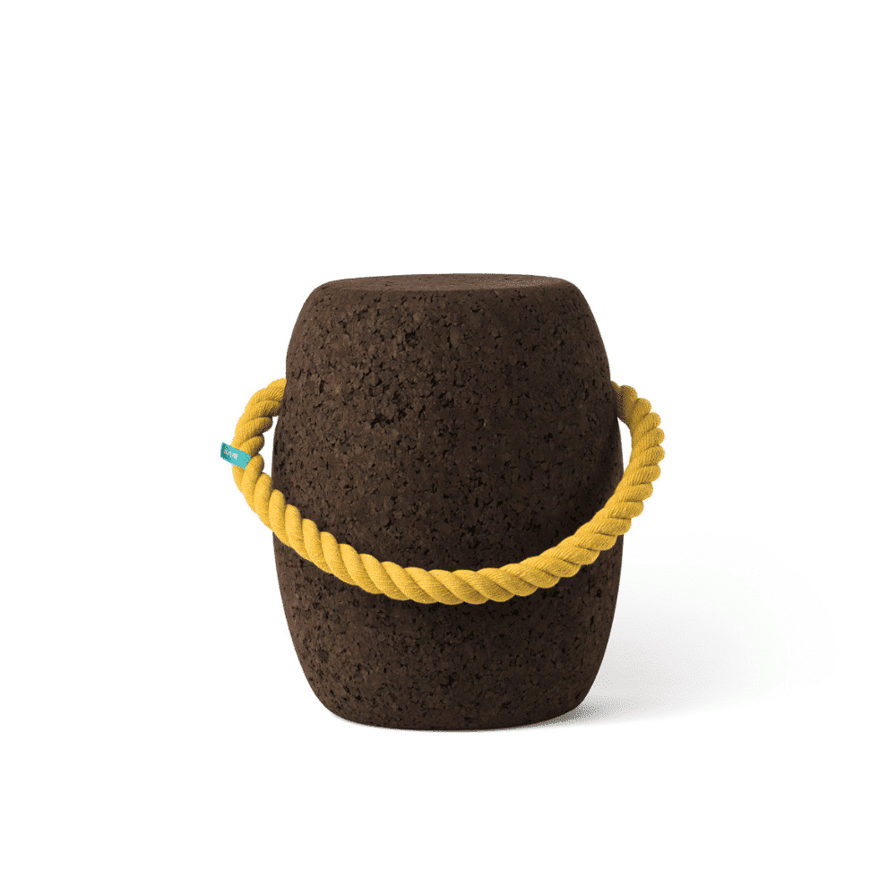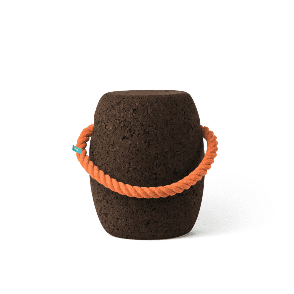 Este versátil taburete se fabrica en corcho oscuro aglomerado, en referencia al tono de las barricas envejecidas.
