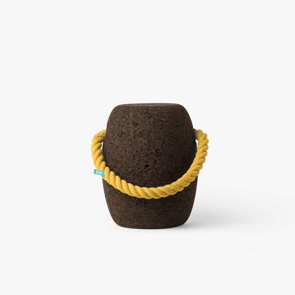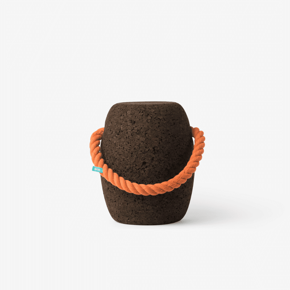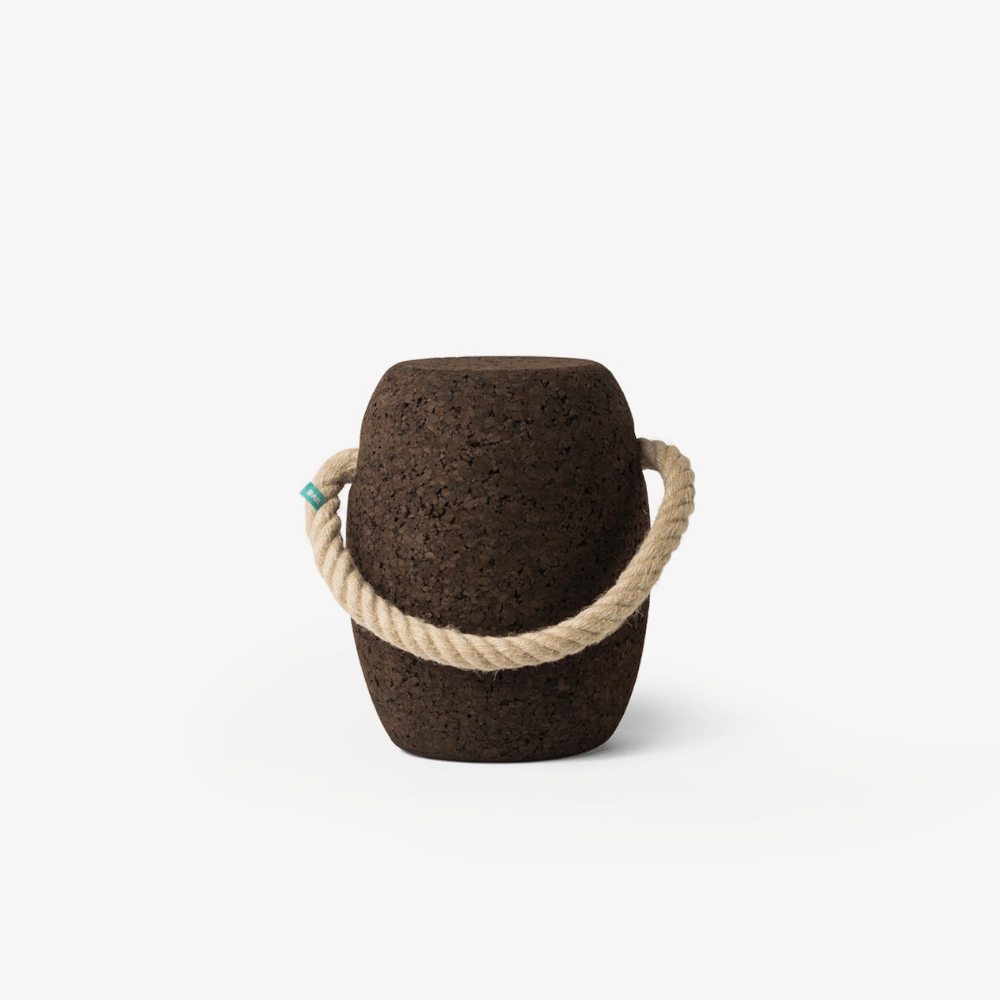 Este versátil taburete se fabrica en corcho oscuro aglomerado, en referencia al tono de las barricas envejecidas.