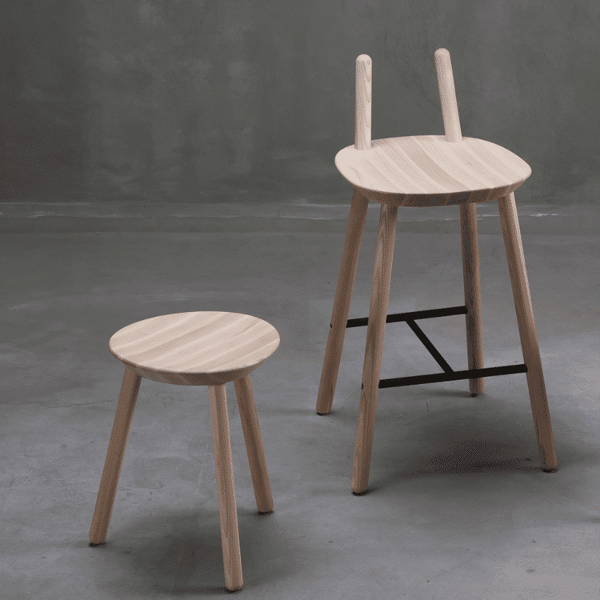 Estos taburetes cuentan con una sólida estructura de madera de fresno que puede estar pintada de negro o al natural y aceitada, según corresponda por el modelo seleccionado. Este tipo de madera se caracteriza por ser densa y dura, con una alta resistencia y tolerancia al impacto. En tanto a su aspecto, es claro, posee grano medio y fibra recta, lo que le otorga una apariencia homogénea y limpia.