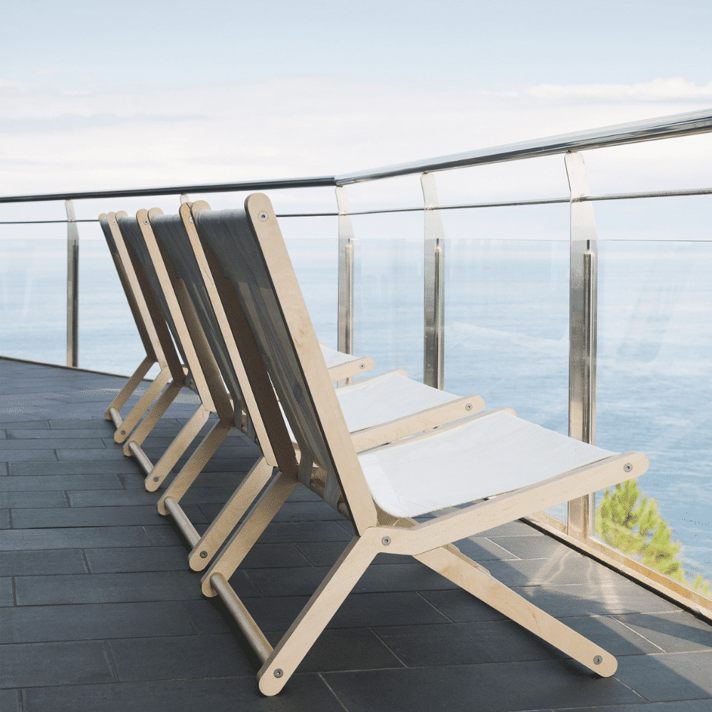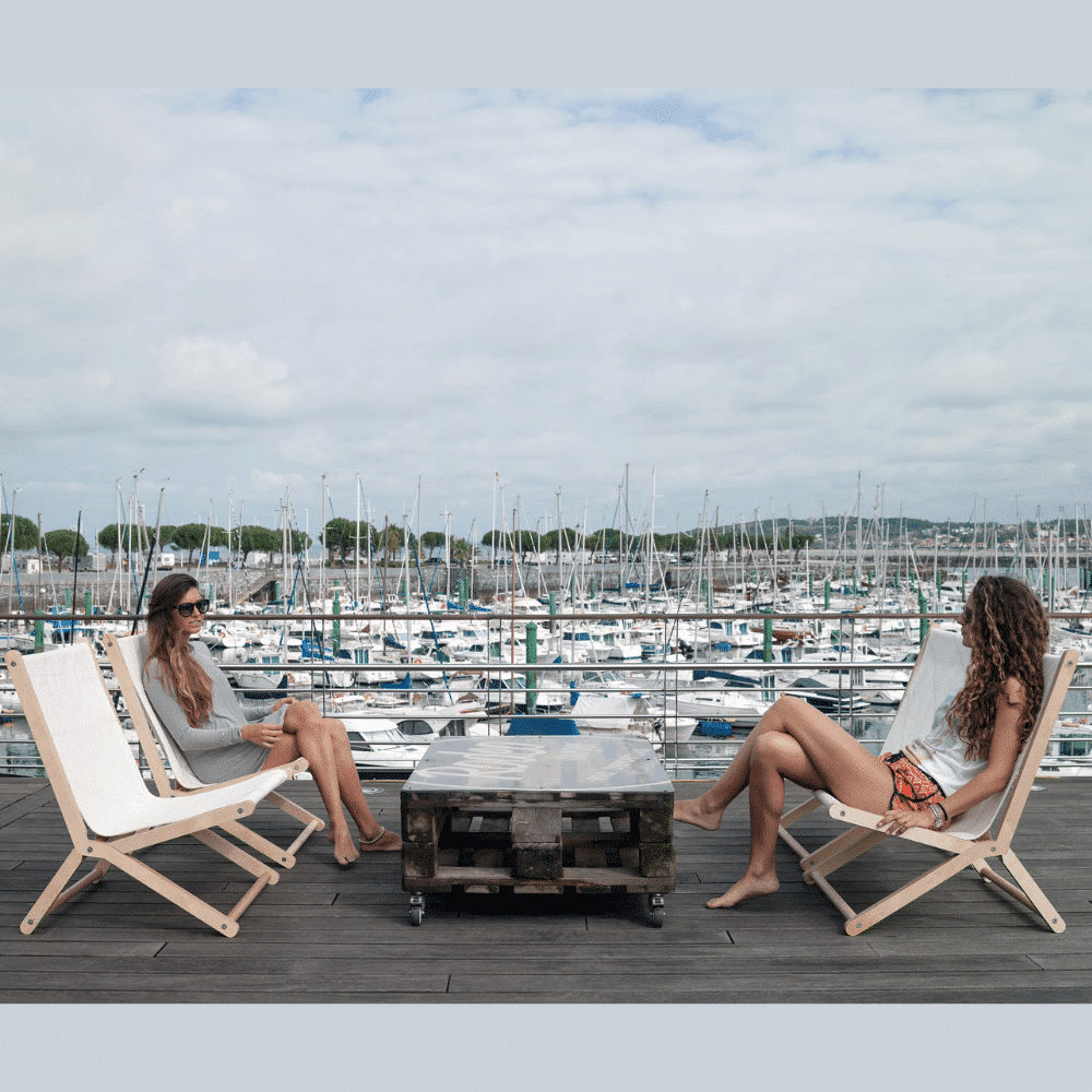 Uniones mediante tornillería de acero inoxidable. El asiento y su respaldo están fabricados en tela de poliéster procedente de una vela recuperada y tensada en tres de las barras.