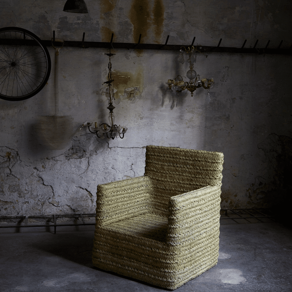 Butaca artesanal realizada con fibras naturales de esparto y estructura de madera de pino.